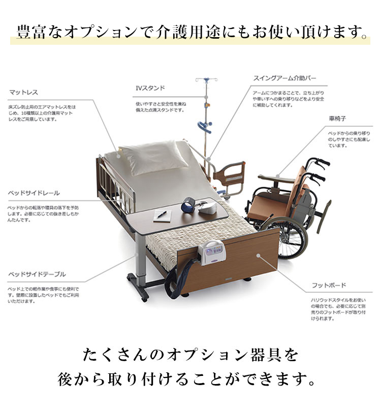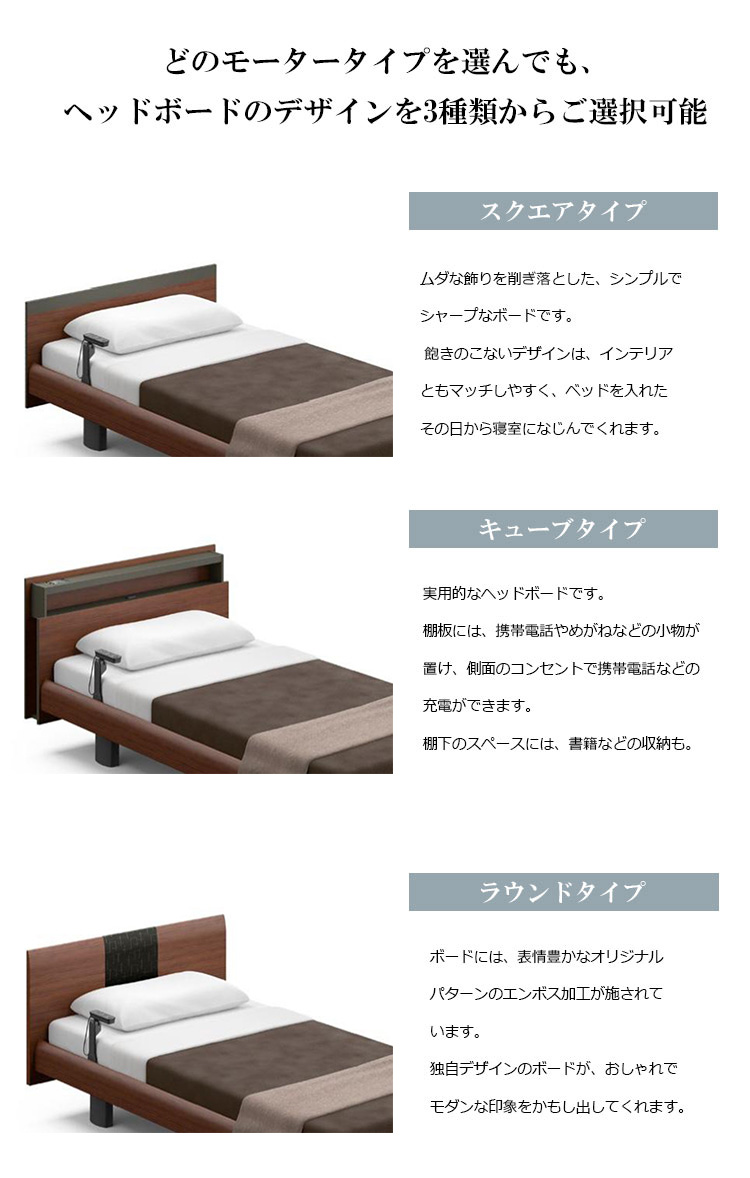 TOP 電動リクライニングベッド 2016年秋に登場して以来多くの方にご愛用頂き、たちまち当店の大人気商品となった電動リクライニングベッド。 パラマウントベッドの「アクティブスリープ」シリーズ。世の中にたくさんの電動ベッドがありますが、私がこの商品をおすすめするのには理由があります。 ①介護用品のトップメーカー「パラマウントベッド製(日本製)」だということ。 ②手すり、テーブルなどの介護用品を後からオプションで追加できること。 ③「1+1モーター」、「3モーター」必要なタイプを選べること。 ④デザインがお洒落かつ、価格がリーズナブルなこと。 電動で動作するベッドですので、誤作動を起こさない安心の製品を使いたいですし、万が一故障してしまった時は迅速に修理したいですよね。そういった点がパラマウントベッドは大変信頼が置けます。病院に入院している時にパラマウントベッドだったから、同じ製品が良いという方もいらっしゃいます。 デザインもお洒落で洗練されておりどんなお部屋にも合います。介護ベッドっぽくないデザインが大変好評です。 これだけ機能が付いて価格がとってもリーズナブルなところもおすすめできる理由です。 「背上げ」「脚上げ」「上下の昇降」、3つの機能を必要な分だけ選べます。 寝起きを楽にするために「背上げ」機能があったら楽だなぁ、足がむくむから「脚上げ」機能があると良いなぁ、将来的に介護が必要になった時に、「上下の昇降機能」があると、介助する人の負担が少ないかななど、使う方のご希望に合わせて選ぶことができます。 「上下の昇降機能」をつけてもリーズナブルな価格に抑えたことが、アクティブスリープの特徴です。 当店で一番人気があるタイプは全ての機能が付いた「3モータータイプ」です。 表情の異なる3種類のヘッドボードからお選びいただけます。 シンプルなデザインの「スクエア」、収納付きで使い勝手が良い「キューブ(宮付き)」、デザイン性豊かな「ラウンド」、お好みでお選びください。 スクエアとラウンドは一見似ていますが、厚さが全く異なります。スクエアはボードの厚さは約1.5cm、ラウンドは2.5cmほど厚みがありますのでしっかりしています。またラウンドはボード表面にエンボス加工がしてあり、お洒落に見えます。 キューブ(宮付き)は、当店の一番人気。上部に時計や携帯電話など小物が置けますし、サイドに雑誌や薬などを収納できるスペースもあります。またコンセント(1口)も付いていますので、とっても便利ですよ。迷ったらキューブをおすすめします。 ベッドのフレームカラーはホワイト系、ブラウン系、グレー系の全3色。ボードカラーはさらに5色を加え、全8色からお選びいただけます。フレームとボードを同色でまとめる。あるいは、それぞれの色を組み合わせてアクセントを持たせるなど、選択の幅が広がります。またラウンドタイプでは、ボードのフレームカラーもお選びいただけます。 ※ベッドの価格は、機能・スタイル・ボードタイプの組み合わせで異なります。 ※下記、カラーシミュレーターをクリックし公式HPでご確認ください。 機種によっては、設定のない組み合わせもあります。また、組み合わせによってはお届けに時間がかかる場合があります。詳しくはお問い合わせください。 将来介護が必要になった時、必要なアイテムをオプションで後付けできます。 おふとんが落ちるのを防止する「ベッドサイドレール」「フットボード」、立ちあがったり座ったりを楽にする「スイングアーム介助バー」、ベッド上での作業や食事も可能にする「ベッドサイドテーブル」など、必要なものを必要なだけお選びいただけます。 表示切替: 写真のみ 説明付き 並び順: 標準 レビューの多い順 おすすめ商品順 新着商品順 値段の安い順 値段の高い順 名前:昇順 名前:降順 在庫: 在庫あり 在庫なし含む 1件中1件~1件を表示 商品一覧 「アクティブスリープマットレス」介護で培ったノウハウでパラマウントベッドがお届けする、100万通りの寝心地からその日のあなたに合わせて硬さ調整できる革新的なマットレス シングル/セミダブル ¥248,160(税込) ~ 在庫を確認する 1件中1件~1件を表示