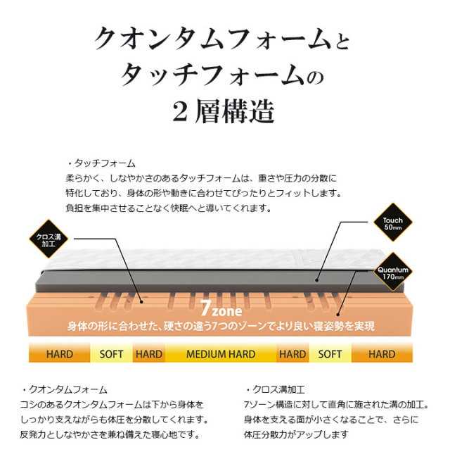 上層のタッチフォームの厚さは5cm、下層のクオンタムフォームは17cm。厚さが24cmありますので、弾力のある寝心地になります。