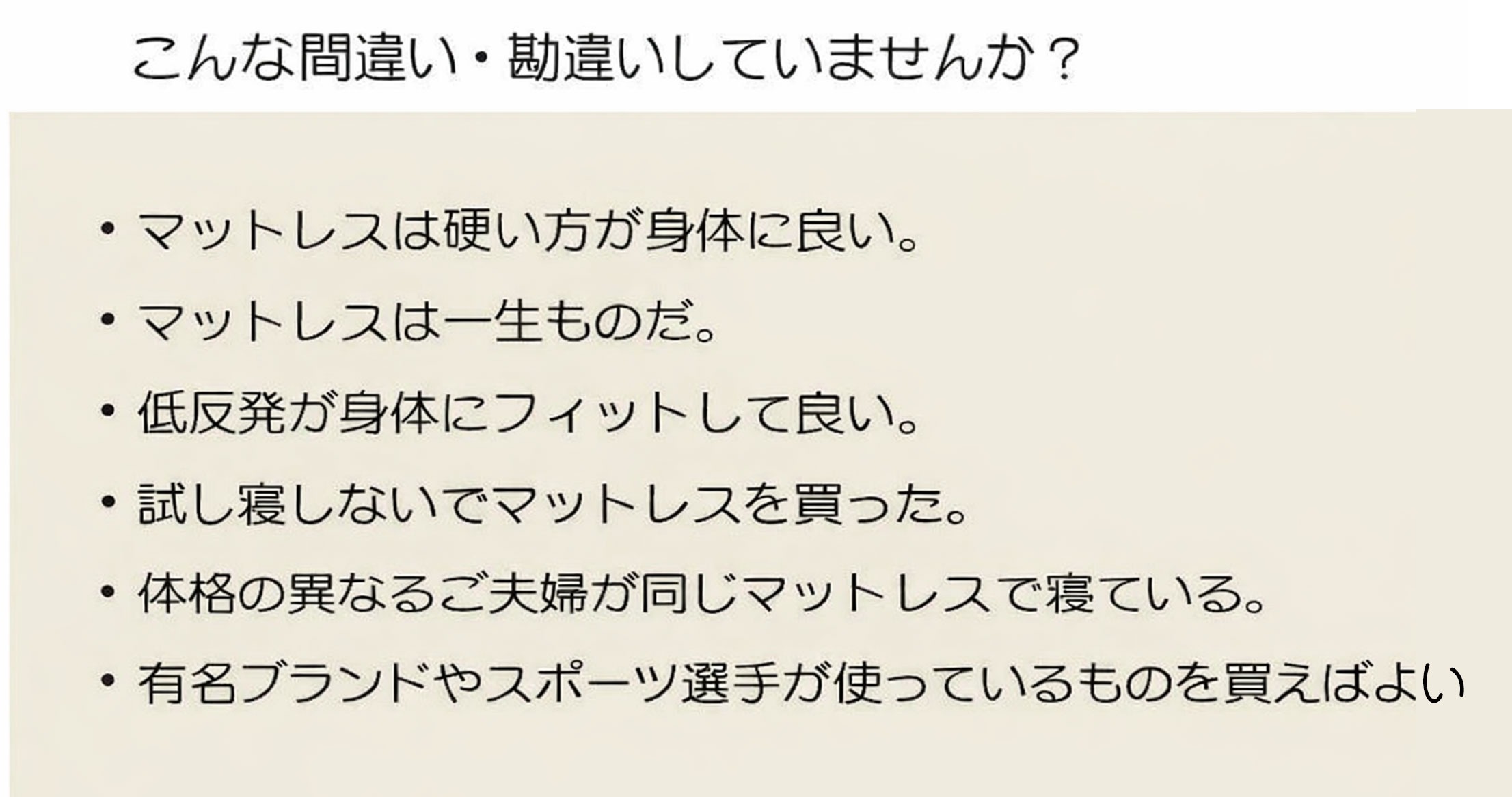 「大リーグの○○選手愛用のマットレス」「○○旅館や〇〇航空のファーストクラスで採用されたマットレス」「アメリカの3大マットレスブランド」など、大きく宣伝されている安心感はありますね。ただ、そのマットレスがあなたにも合うかというと別問題です。