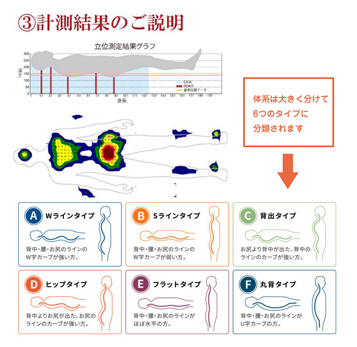身体のライン(凹凸)がデータ化されて出てきますので、どのくらい首や頭に隙間が空くのか、腰に隙間が空くのかを客観的にご覧いただけます。